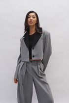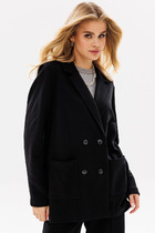 Двубортный жакет умеренного объема, полуприлегающего силуэта. Нагрудные вытачки на полочках расположены вертикально и совмещены с талиевыми, заканчиваются входом в карман. Карманы прорезные, в рамку с клапаном. Спинка имеет плечевые вытачки, средний шов со шлицей. Рукава двухшовные, длинные. Воротник – стойка переходит в край борта, имеющий V-образную форму. Застежка на прорезные петли и пуговицы. Жакет полностью обработан притачной подкладкой. Длина изделия до середины бедра. Длина по спинке 71 см, длина рукава 61 см.