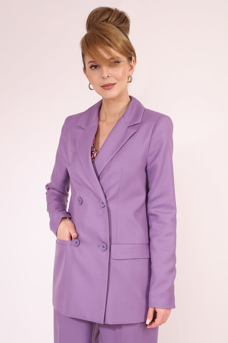 Двубортный жакет на подкладке полуприлегающего силуэта из тонкого костюмного полушерстяного полотна.