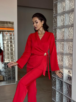 Жакет двубортный свободного объёма без воротника с застёжкой на кнопки. По переду расположены карманы с клапаном.