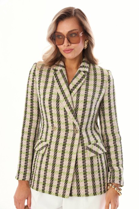 Жакет двубортный умеренного объёма из тёплой мягкой ткани. Застёжка на две пуговицы. По бокам расположены функциональные прорезные карманы с клапаном. Жакет на подкладке. Длина жакета по спинке 70-71 см.