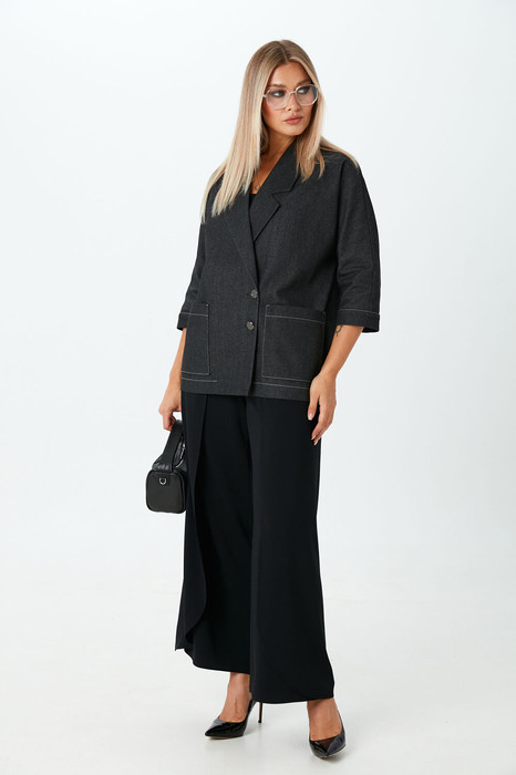 Жакет большого объёма с двубортной застежкой по одной стороне на петли и пуговицы. Рукава 3/4 с манжетами. Жакет без подкладки. По переду расположены накладные карманы. Длина жакета по спинке 70-72 см.