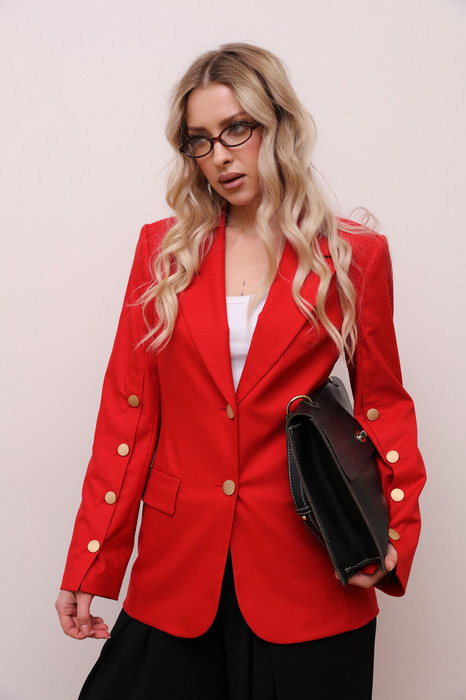 Яркий однобортный жакет приталенного силуэта с застёжкой на 2 пуговицы. По бокам расположены функциональные прорезные карманы с клапанами. Жакет на подкладке. На рукавах жакета выполнены функциональные застёжки на петли и пуговицы.