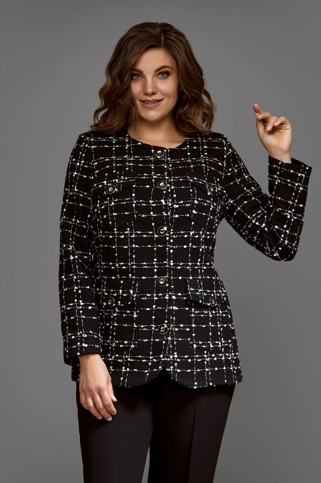 Стильный женский жакет из костюмной ткани в клетку (не тянется), выполнен в стиле «шанель». Жакет полуприлегающего силуэта на подкладке. Перед с нагрудными вытачками, накладными карманами с клапанами. Застежка центральная на петли и пуговицы, горловина округлой формы. Спинка со средним швом. Рукава втачные двухшовные.