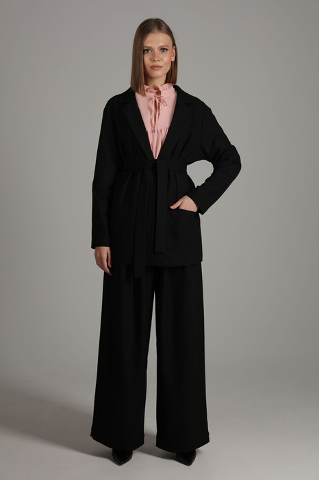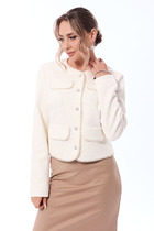Жакет свободного прямого силуэта длиной ниже линии бедер из костюмной ткани. Изделие со съемным поясом, на подкладке и накладными карманами. Рукав втачной, двухшовный, пройма спущена. Воротник английский. Застежка не предусмотрена.