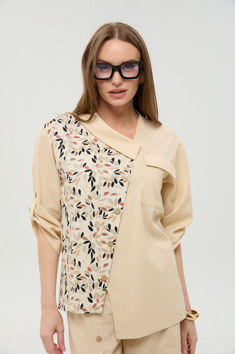 Жакет рубашечного типа прямого силуэта с асимметричным низом. Рукав втачной со спущенной линией плеча, фиксируется на пату. Застежка центральная на петли и пуговицы, смещённая по косой. Воротник отложной на стойке до половины спинки.