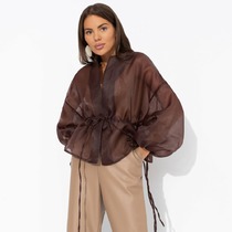 Жакет прямого силуэта, воротник пиджачного типа, рукав одношовный, втачной с незначительно спущенной линией плеча, длиной три четверти, с патой. По линии ткани настрачная кулиса с завязками из основной ткани. Застежка центрально-бортовая. Линия низа верхней части фигурная ассиметричная.