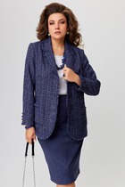 Текстильный жакет трапециевидного силуэта с высокой шлицей по спинке. Детали: свободный покрой, пиджачный воротник, талиевые вытачки, функциональный нагрудный карман, прорезные карманы с клапанами, застежка на пуговицы, спинка со средним швом и высокой шлицей, рукава втачные двухшовные, жакет на подкладке.