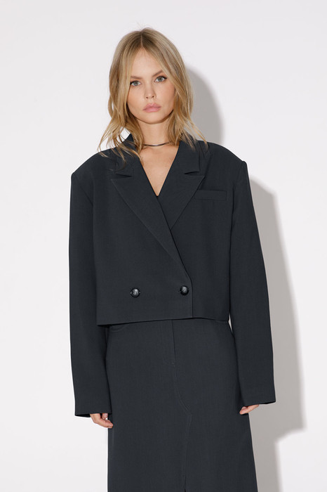 Укороченный оверсайз жакет с расширенными плечами. Детали: прямой силуэт, спущенная линия плеча, пиджачный воротник, перед с функциональным нагрудным карманом, застежка двубортная на петли и пуговицы, рукава втачные двухшовные, жакет на подкладке.