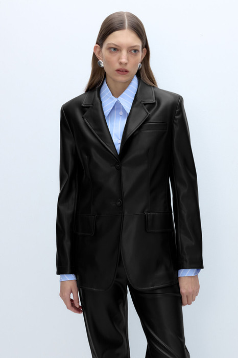 Свободный однобортный жакет из экокожи.