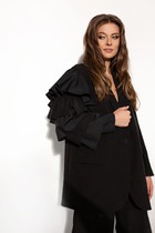 Детали: жакет прямого силуэта, расширенная линия плеч, пиджачный воротник, перед с прорезными функциональными карманами, однобортная застежка на петли и пуговицы, спинка со средним швом и шлицей, рукава втачные двухшовные, жакет на подкладке.