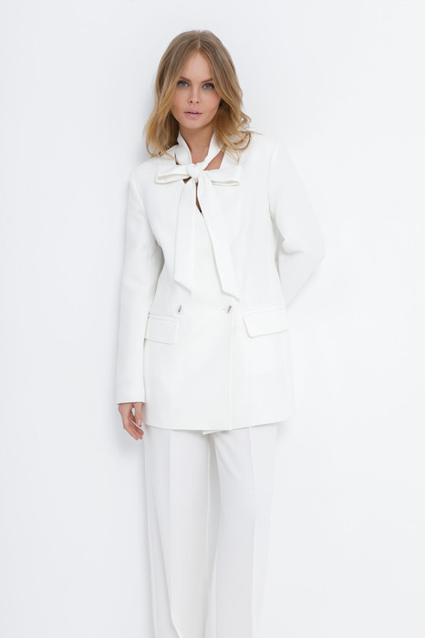Детали: жакет полуприлегающего силуэта, отрезные бочки, воротник-бант, двубортная застежка на петли и пуговицы, спинка со средним швом и шлицей, втачные длинные рукава со шлицами, жакет на подкладке.