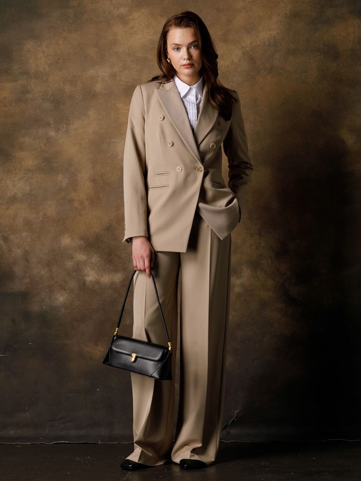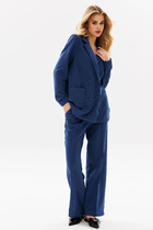 Модель полуприлегающего силуэта, с рельефами, на подкладе. Застёжка двубортная на петли и пуговицы. Спереди прорезные карманы в рамку, а также имитация кармана и декоративные пуговицы. Спинка со средним швом. Воротник пиджачный. По низу рукава обработана шлица с отделочными петлями и пуговицами.