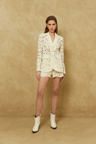 Жакет полуприлегающего  силуэта, выполнен из структурной ткани. Округлый вырез горловины. Застежка центральная на петли и пуговицы. Спереди обработаны декоративные клапаны с пуговицами. Рукава втачные двухшовные. Спинка со средним швом и рельефами. Жакет на подкладке.
