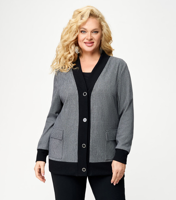 Кардиган женский прямого силуэта с застежкой на пуговицы, по переду с накладными карманами с клапаном. Рукав длинный, низ обработан притачной манжетой. По низу изделия притачной пояс. По переду и горловине спинки притачная планка.