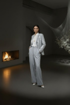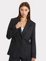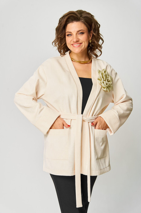 Жакет женский свободного прямого силуэта, длиной ниже линии бедер, без подкладки со съемным поясом и накладными карманами. По переду и горловине спинки притачная планка, без застежки. Линия плеча слегка спущена. Рукав втачной длинный с отложной манжетой. В боковых швах разрезы. Украшен жакет съемным цветком из отделочной ткани.