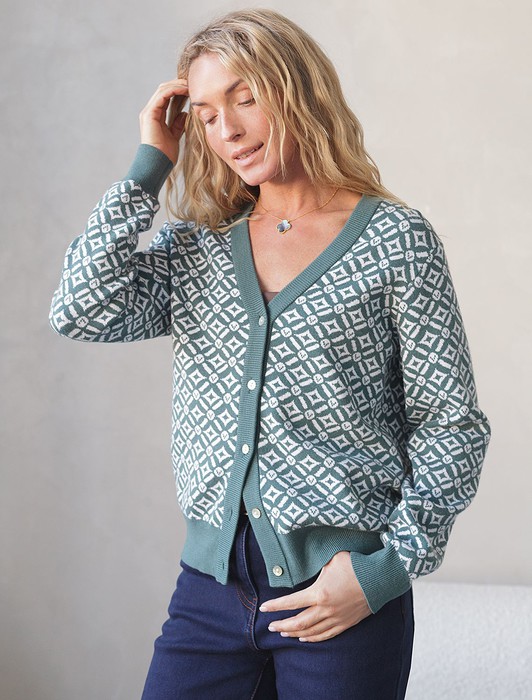 Состав: 50%Вис 30%ПЭ 20%ПА Плотность: 12 GGЖакет полынного цвета выполнен из мягкого трикотажа на основе шелковистой эластичной поливискозы. Жаккардовое переплетение образует геометрический узор. Застежка на перламутровые пуговицы подчеркивает гладкую пряжу. Жаккардовое вязание - это один из самых дорогих способов изготовления трикотажных изделий, так как для вязания используется сразу несколько цветов нитей. Жаккард вяжется намного дольше, чем однотонное полотно, имеет гораздо больший вес и плотность. Благодаря этому трикотаж дольше сохраняет красивый внешний вид, не пилингуется и не подвержен спуску петель. Модель станет удачной инвестицией в базовый гардероб. Комфортно носить даже на голое тело или как накидку.