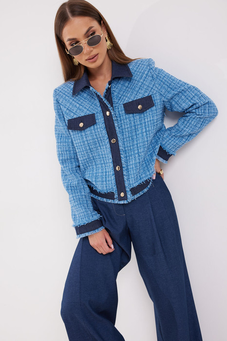 Жакет женский в стиле «шанель» прямого силуэта, длиной выше линии бедер, на подкладке, застежка центральная на планку с петлями и пуговицами. По спинке и переду кокетки, выкроенные по косой, в швах кокеток клапаны из отделочной ткани. Воротник стояче-отложной. Рукав втачной двухшовный с притачными манжетами из отделочной ткани. Воротник, планки, клапаны, манжеты и планка по низу жакета  - из отделочной ткани. По швам притачивания планок и манжет декоративная бахрома из основной ткани.