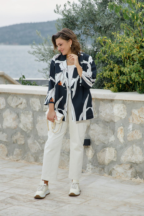 Этот жакет — история о контрастах. Тёмный, глубокий фон и лёгкий, светлый рисунок. Скрывающий силуэт покрой и откровенная, притягивающая взгляд красота принта-идеальный вариант для тех, кто любит привлекать внимание, он сочетает в себе летнюю расслабленность и деловую элегантность. Данный жакет станет отличным вариантом для повседневных образов, а также для работы в офисе. Прямой крой и сдержанный крупный принт помогут скрыть все несовершенства фигуры и создать идеальный силуэт. Жакет прямой, свободного силуэта, с центральной застёжкой на петлю-пуговицу, с отложными лацканами. Карманы - в боковых швах. Спинка жакета со средним швом. Рукав со спущенной линией плеча, длиной 3/4. Жакет без подкладки. Длина спинки жакета 71 см. Длина рукава жакета 45 см.