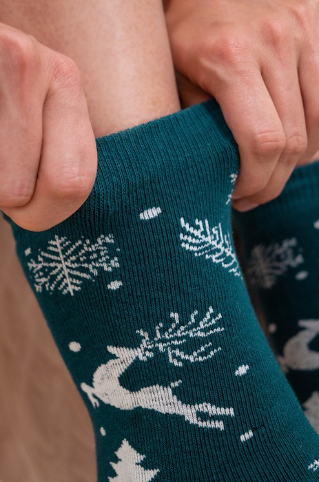 Длинные термо носки с принтом согреют ножки в морозные дни. Они подходят для осенних прогулок, зимних видов спорта, под коньки и лыжные ботинки. Новогодние носочки из трикотажа будут отлично смотреться в тандеме с домашними тапочками. Утепленные носки нефритового цвета идеальны для тематических фотосессий для всей семьи.