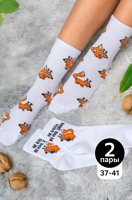 Высокие женские носки представлены в белом цвете и украшены смешными рисунками Белки, в наборе 2 пары. Демисезонные носки выполнены с высоким содержанием натурального хлопка.