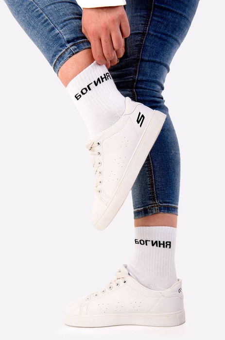 Женские белые носки с прикольной надписью на широкой резинке. Носки с высоким содержанием хлопка имеют классическую высоту. Резинка плотно облегает ногу, не позволяя носкам сползать со ступни, не сдавливает ногу.
