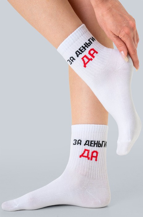 Белые женские носки выполнены из натурального хлопка и украшены прикольной надписью За деньги да.