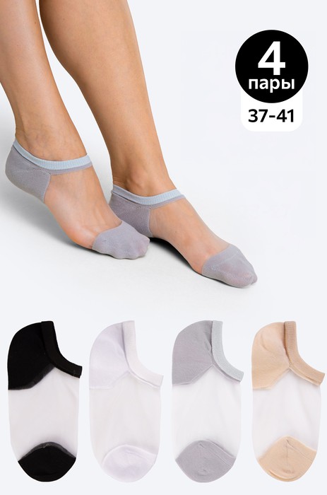 Милые короткие носочки — настоящая находка для любительниц комфорта и эстетики! Женские капроновые следки в наборе из 4 пар дарят ногам лёгкость и уют. Базовые цвета подойдут под любой стиль, а прозрачные вставки добавят пикантной нежности в каждый шаг.