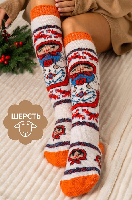 Теплые новогодние гольфы для женщин выполнены с высоким содержанием натуральной овечьей шерсти. Высокие шерстяные носки с рисунком Матрешка идеальны для уютных вечеров. Яркий узор добавит приятных эмоций, а теплая пряжа согреет в прохладное время года.