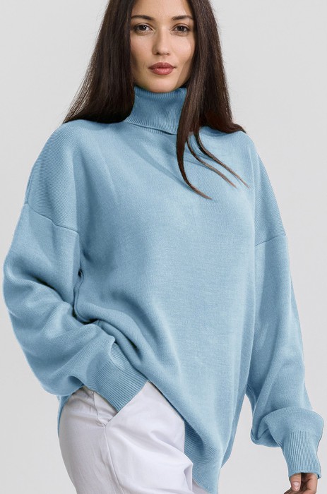 Удлиненный голубой свитер выполнен из вязаного трикотажа с добавлением натуральной шерсти и хлопка, что позволяет ему быть очень уютным, мягким и приятным к телу. Женский джемпер с высоким воротом позволит сохранить тепло морозной зимой.