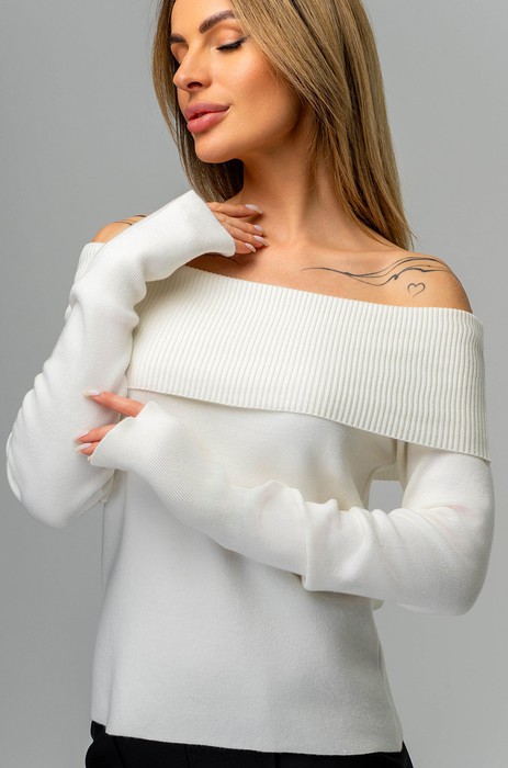 Кофта имеет облегающий крой, который гармонично подчёркивает силуэт, создавая женственный образ. Прямой крой и открытые плечи добавляют элемент изысканности, а декольте с отворотом вносит деликатную нотку романтичности. Трикотажная демисезонная модель с длинным рукавом подходит для разнообразных решений.