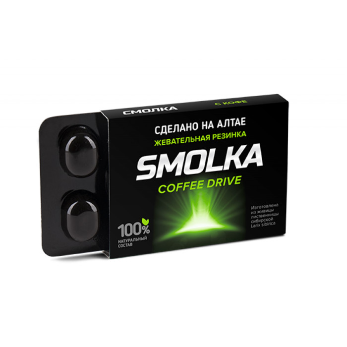 Жвачка «Смолка с кофе» - уникальное сочетание сибирских традиций и новейших представлений о полезных стимуляторах. Теперь для того чтобы взбодриться или сосредоточиться достаточно просто бросить в рот 1-2 жевательных резинки. Продукт создан на основе лиственничной смолы. Это вещество оптимизирует во рту кислотный баланс, прибьет микробов, устранит запах и снимет воспаления десен. Второй компонент – натуральный кофе, свойства которого никому представлять не нужно: заряд бодрости, стимулирует все виды активности, благотворно влияет на печень, расширяет сосуды и при этом обладает отменным ароматом!