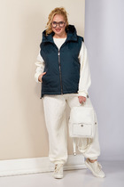 Жилет укороченный, выполнен из стеганной трикотажной ткани серого цвета. Характеристика: жилет А-силуэта, вортник стойка, капюшон цельный с жилетом, центральная застежка на молнию, скрывается под планкой на кнопках, боковые карманы на молнии, по низу изделия резинка с фиксаторами, брендированный подклад, спинка цельнокройная. Длина изделия от края горловины по спинке 58см.