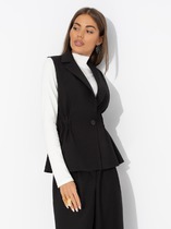 Скроен по фигуре, создан по характеру. Этот чёрный жилет знает, чего он хочет – и знает, чего хотите вы. Мягкая ткань не сковывает движений, ведь твой день – это марафон, где важно успеть обнять, решить и вдохновить. Жилет приталенного силуэта с лацканами. Линия талии выделена скрытой резинкой. Изделие застегивается на пуговицу.