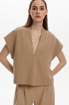 Жилет удлиненный свободного прямого силуэта, воротник пиджачного типа. Линия низа по переду и спинке фигурная ассиметричная. Короткий рукав-крылышко. Талия фиксируется съемным ремнем из экокожи, для которого в боковых швах оформлены шлевки. Ремень идёт в комплекте к изделию.