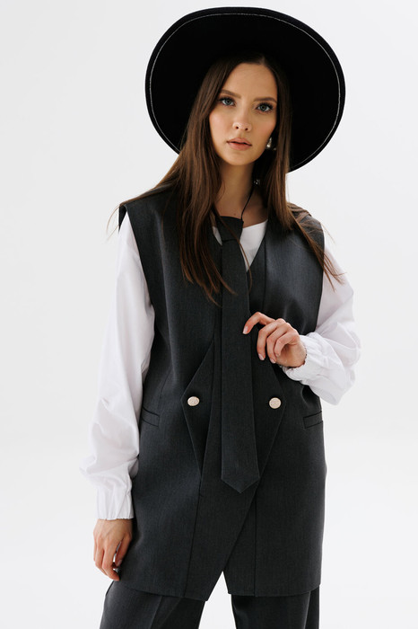 Жилет двубортный прямого кроя объёма оверсайз. Застёжка фигурная на петли и пуговицы. Карманы - листочки.
