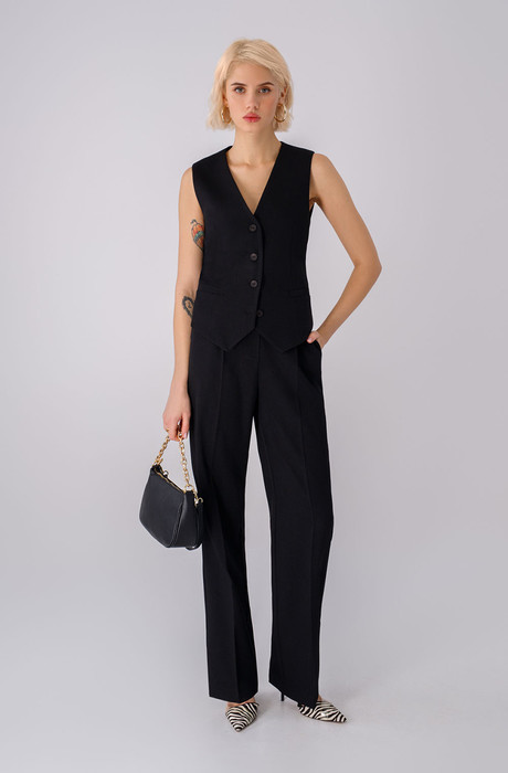 Классический жилет из текстильной ткани. Детали: жилет полуприлегающего силуэта с фигурным низом, застежка на петли и пуговицы, на подкладке