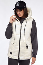 Жилет женский стеганый, прямого силуэта с капюшоном, застежкой на молнию, кокетками и подрезами по переду и спинке, прорезными карманами на молнии, на подкладке. Утеплитель синтепон.