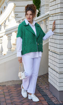 Жилет женский прямого силуэта, со спущенной линией плеча, на подкладке. По горловине капюшон. По переду прорезные карманы с листочкой. Спинка в верхней части со швом, по спинке и полочке косые подрезы. Застежка смещенная на молнию. Низ жилета фигурной формы. Отличный вариант жилета для стильных образов!