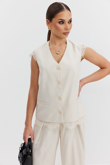 Жилет женский из льняной ткани полуприлегающего силуэта на кружевной подкладке, вырез горловины глубокий V-образный, спинка со средним швом, по переду рельефные швы и листочки (имитация карманов). Застежка центральная на петли и пуговицы. Декоративные элементы из кружева по низу жилета и верхней части проймы в виде рукава-«крылышка».