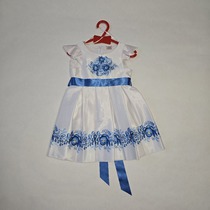 Описание: Очаровательное платье для девочек, выполнено из атласа с принтом "гжель". Модель с рукавами-крылышками и круглым вырезом горловины, застежка-молния на спинке. Линия талии подчеркнута синим поясом, который завязывается в бант, подол пышной юбки украшен узором "гжель." Наличие хлопковой подкладки обеспечивает комфорт для нежной детской кожи.