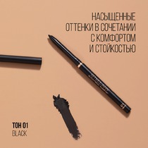 Отличиями карандаша являются очень мягкий, буквально гелеобразный грифель и великолепная насыщенность пигмента. Таким грифелем вы не поцарапаете кожу и без проблем нарисуете аккуратную плавную стрелку, так как он не оставляет проплешин и не образует на веках комочков. Карандаш хорошо наслаивается, позволяя провести легкий, едва заметный контур и яркую, насыщенную стрелку. Через несколько минут после прорисовки рисунок застывает, после чего не размазывается и не расплывается по коже в течение дня.