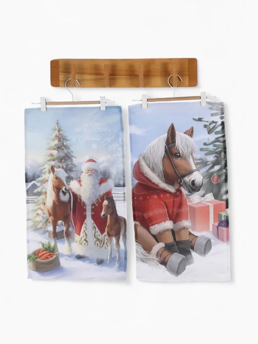 — Набор кухонных полотенец 2шт из рогожки Лошадь и Дед Мороз
