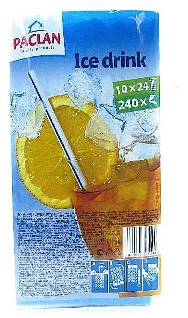 Новые пакеты для льда Paclan Ice drink. Самозакрывающиеся пакетики - простой и удобный способ приготовления льда для коктейлей, соков, прохладительных напитков. Материал, из которого изготовлены пакетики не пропускает посторонних запахов. Пакетики также могут применяться для замораживания отваров трав с последующим применением в косметических целях. Упаковка содержит 10 мешков, в каждом из которых по 24 кубика льда.