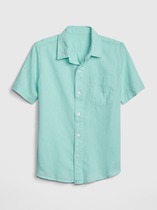 Новая рубашка известного, американского бренда Gap, Kids Short Sleeve Shirt In Linen-Cotton. Детская рубашка с коротким рукавом из льна и хлопка. Откидной воротник, пуговицы спереди и накладной карман на груди. Цвет: surf spray. Состав: 55% лен, 45% хлопок. Размер: XL для мальчика 12 лет, ростом 145-152 см.