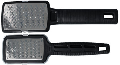 Рука полностью помещается на ручку, которая удобная и препятствует соскальзыванию даже при незначительном хвате. В переходной части от ручки к тёрочной поверхности , мы видим упор для большого пальца руки. Небольшая изогнутость пластины нужна для того , чтобы качественно срезать кожу. Это срезающая тёрка предназначенная для сухого педикюра и срезания натоптышей, а так же огрубевшей кожи и уже засохших мозолей. Делает она это великолепно. Хочется сказать , что по сранению с липсовой , эта изогнутость стала меньше, что говорит нам о более тонкослойном снятии кожи.