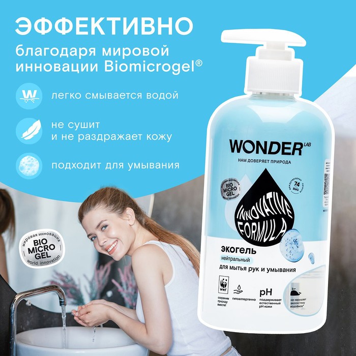 Безопасный и гипоаллергенный эко гель WONDER LAB Нейтральный 500 мл с дозатором создан специально для мытья рук и умывания.
