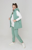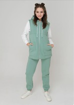 Жилет утепленный, прямой, на молнии, с капюшоном, с фигурной линией проймы. Полочка и спинка с кокетками, В нижней части полочки расположены накладные карманы.
